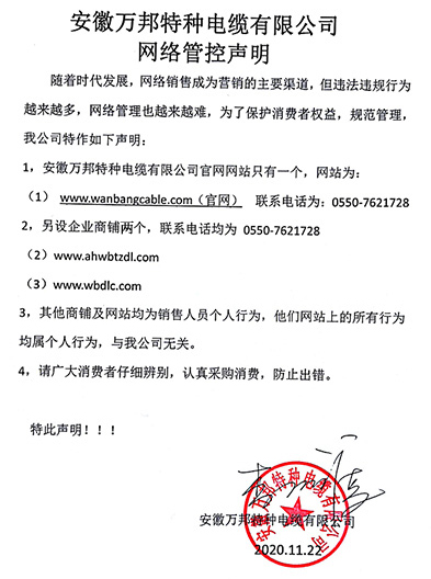 鄭重聲明:安徽萬(wàn)邦特種電纜有限公司官方網(wǎng)站為:www_wanbangcable_com.ahsyw.cn,除此之外無(wú)任何子網(wǎng)站或合作網(wǎng)站,其余均為假冒偽劣。電話:0550-7621728 13485756353 地 址:安徽省天長(zhǎng)市滁州高新技術(shù)產(chǎn)業(yè)開發(fā)區(qū)經(jīng)四路29號(hào)